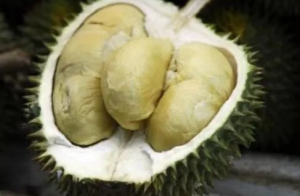 貓山王榴蓮原產馬來西亞,單果重量較小,果皮多為綠色,果肉呈現(xiàn)姜黃色,有凝脂感,榴蓮氣味濃郁,主要特征為無尾尖,果實飽滿,尾部呈星型。