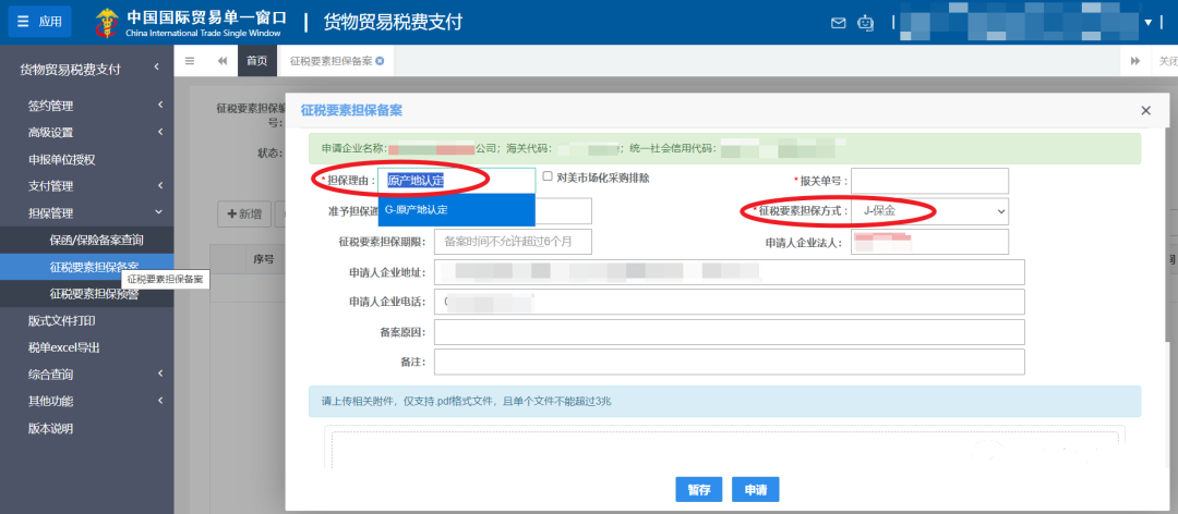 進口貨物的商品原產(chǎn)地尚未確定的,可以在辦結(jié)海關(guān)手續(xù)前對貨物是否具備原產(chǎn)資格向海關(guān)進行補充申報,并申請?zhí)峁?dān)保,要求提前放行貨物。企業(yè)在申報進口時,通過單一窗口“征稅要素?fù)?dān)保備案”模塊提交征稅要素?fù)?dān)保備案申請,海關(guān)核批同意后再選取擔(dān)保備案編號或按照海關(guān)規(guī)定繳納保證金。系統(tǒng)成功核扣擔(dān)保額度或海關(guān)核注保證金后,滿足放行條件的報關(guān)單即可擔(dān)保放行。在線申請擔(dān)保備案入口:中國國際貿(mào)易單一窗口——標(biāo)準(zhǔn)版應(yīng)用——稅費辦理——貨物貿(mào)易稅費支付——擔(dān)保管理——征稅要素?fù)?dān)保備案申請網(wǎng)址(使用電子口岸卡登錄):